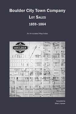 The original records of the Boulder City Town Company show the initial land lottery of 11 Aug 1859 along with the sale and transfer of different lots beginning just after the town’s beginning on 10 Feb 1859 until 1864. This map index details the land sales and shows each lot sold or transferred. Because no original survey map of Boulder City exists, a map was created using the plat map of 1864, an 1868 map that shows a partial view of downtown, and the 1871 and 1887 maps that use the old numbering system from the original survey. None of the extant maps shows the entire original survey, but the blocks and block numbers of the created map are almost exactly the same. The two exceptions are an unnumbered block where the courthouse stands currently (between 13th and 14th Streets, and Pearl and Spruce Streets), and an unnumbered block between 16th and 17th Streets, and Hill [now Mapleton] and Bluff Streets. I believe these two lots were intended to be left unnumbered and used as public squares—one for the courthouse, the other for a school, perhaps. This book shows each land sale along with a mini-view of the block in question with the street names along all four sides of the block for reference.