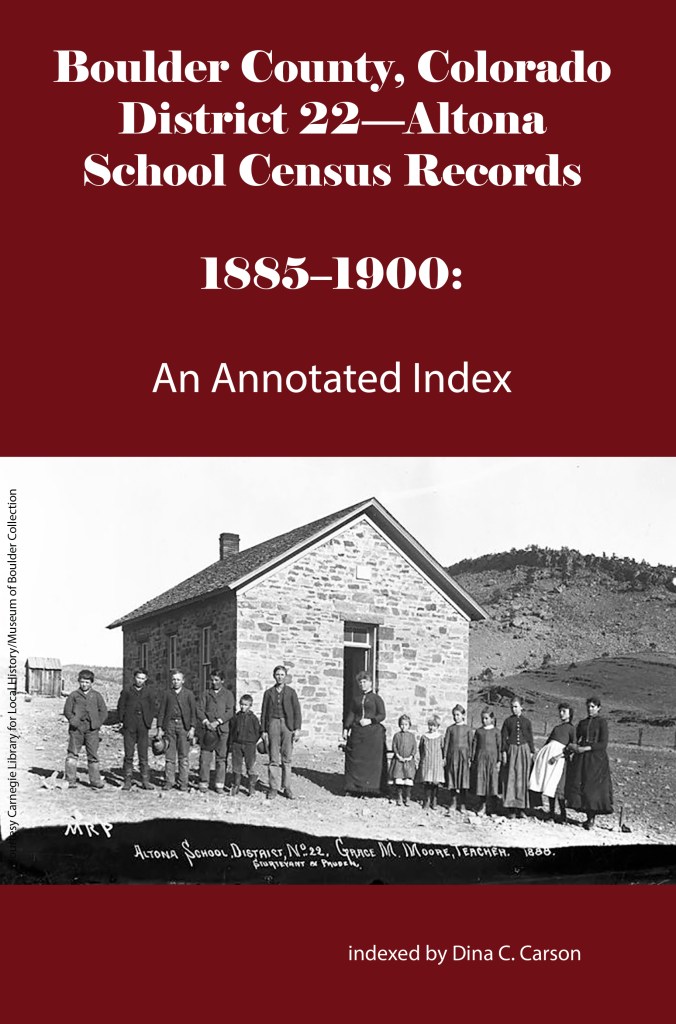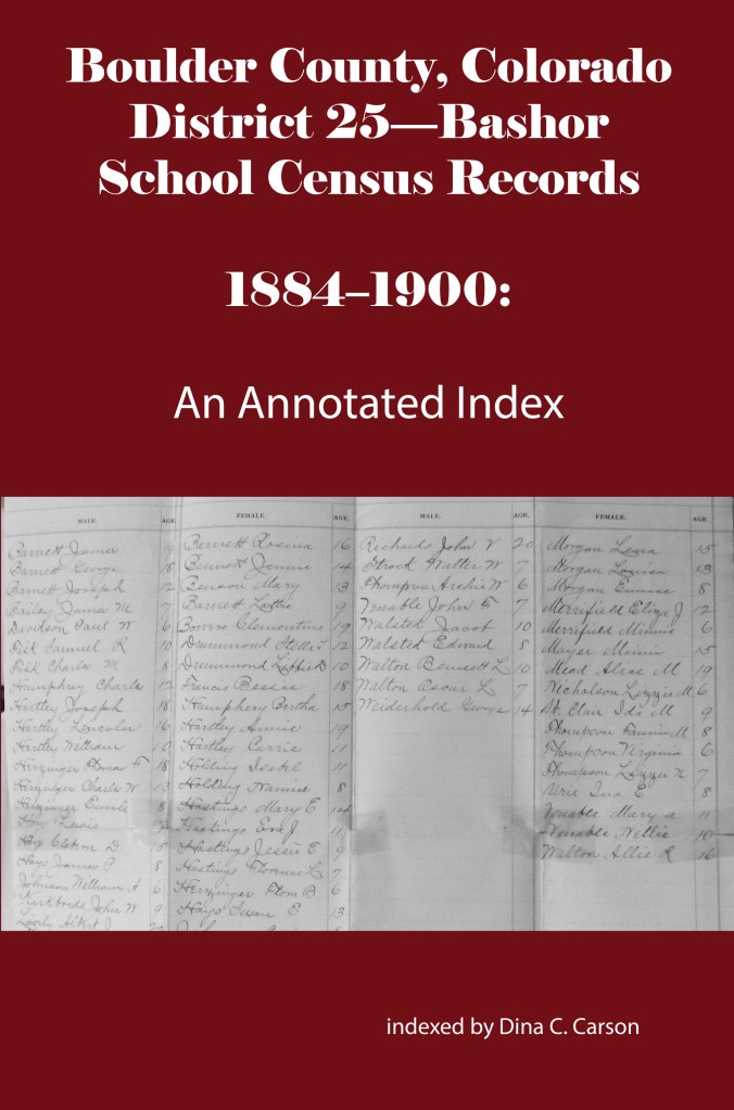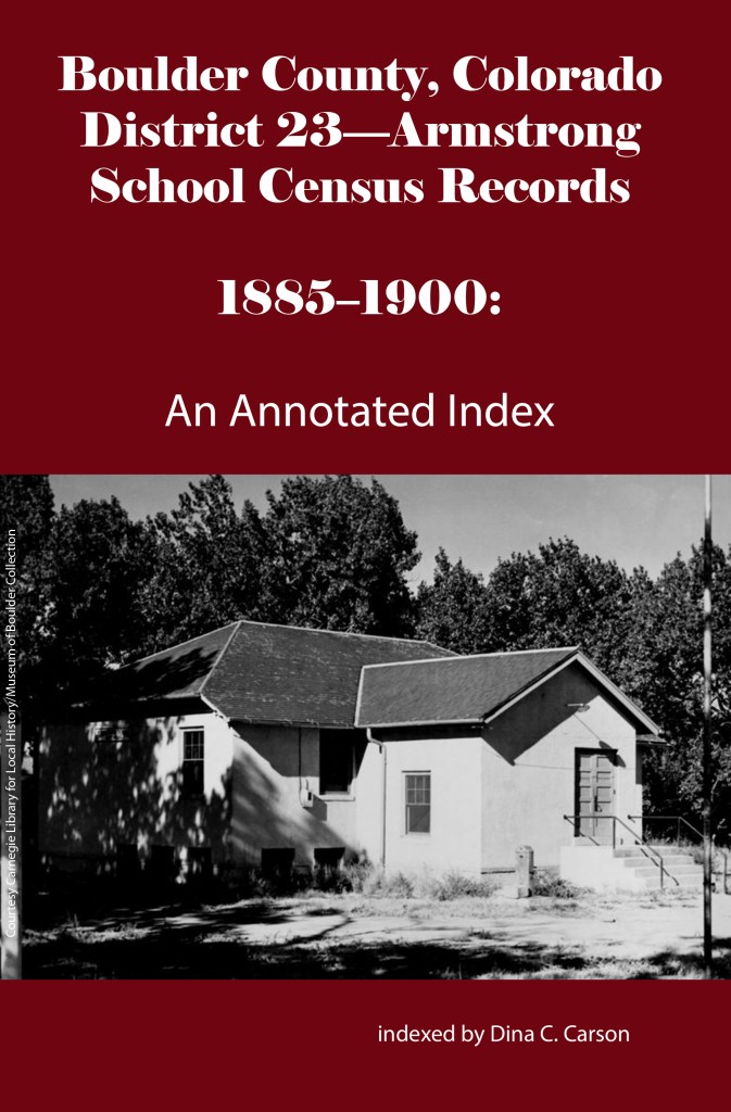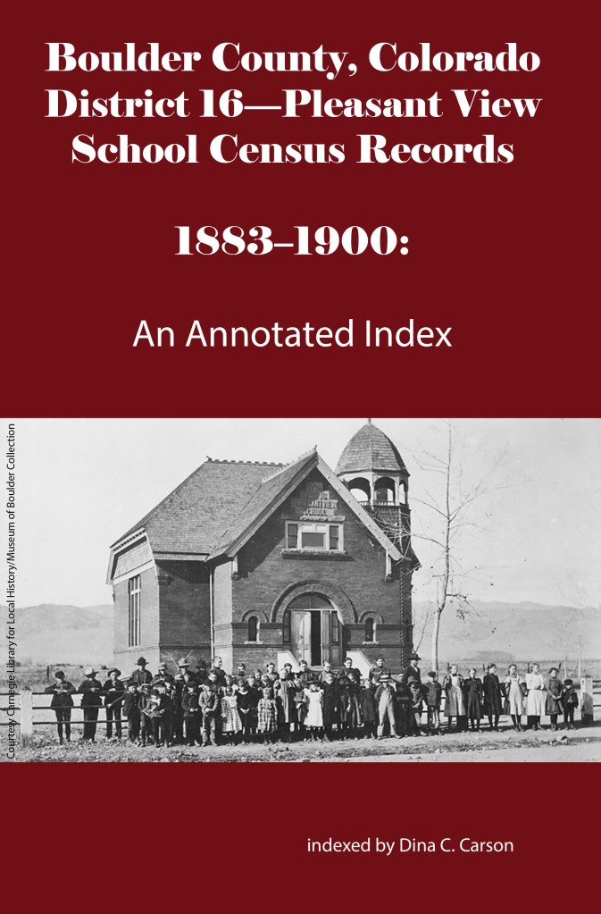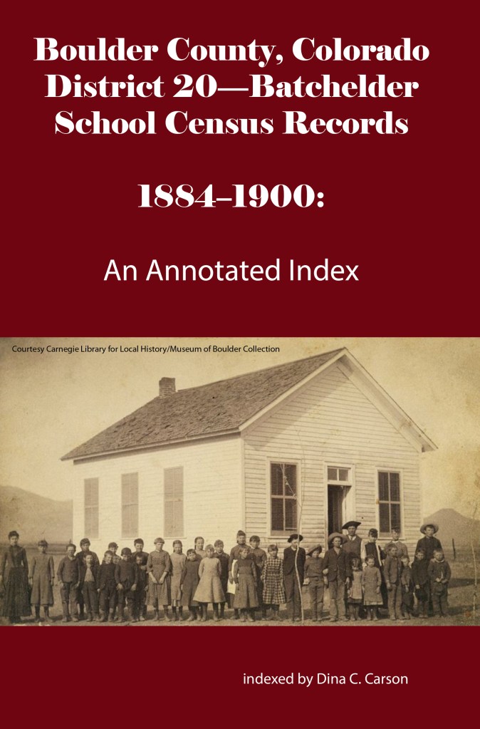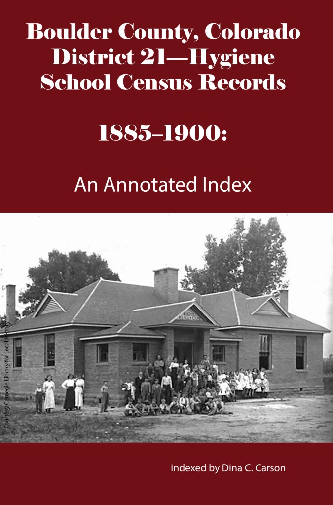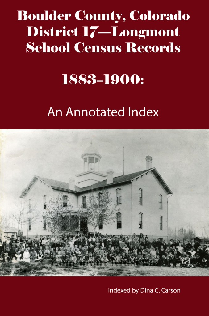 School District No. 17-Longmont was the second largest school district in the county behind the Boulder school district. It was formed in 1871 but there are no extant census records for this district before 1883. Willis A Warner was the Secretary of the district that year, and these are some of the families whose children attended the school: Abbot, Brooks, Bemis, Buckingham, Cantonwine, Clark, Crawford, Daughtry, Epperson, Ferguson, Golden, Huyck, Hatch, Lang, Merriman, O’Connor, Preston, Silver, Tallman & Wiswall.